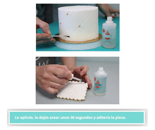 • Es ideal para unir superficies azucaradas. Adhiere decoraciones a las pastas: