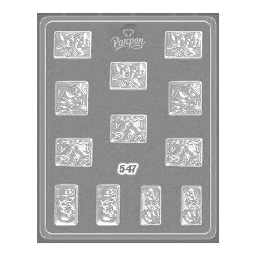 - Placa de acetato para realizar bombones rectangulares con formitas de navidad, Campanas, Bastón, Muñeco de nieve, Casita de navidad, tal como se observa en las imágenes.